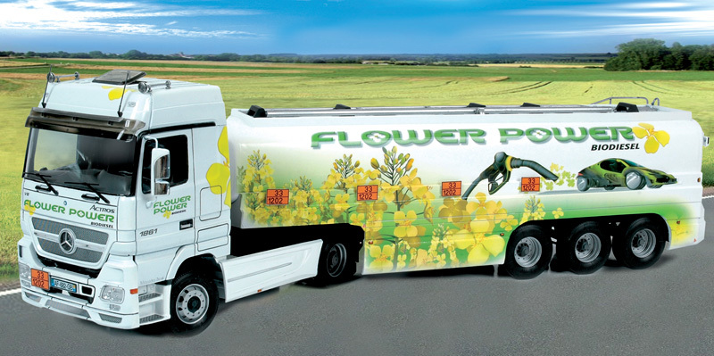 The MB Actros truck launched at the middle of the years 2000 is used to transport heavy loads on long distances. It offers a very high level of performance, comfort and the latest safety equipments. The model reproduced by this kit is of the last generation, featuring wide radiator fins, new headlights and chrome inserts. The TOPAS tank trailer has set the rules of active and passive safety very high and features ABS, low gravity centre, aerodynamic chassis protection, rear mounted camera system and high positioned brake lights. The livery is the one of a biodiesel transport, a vegetable oil based diesel fuel.