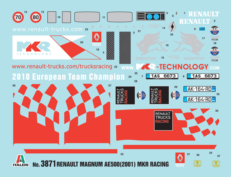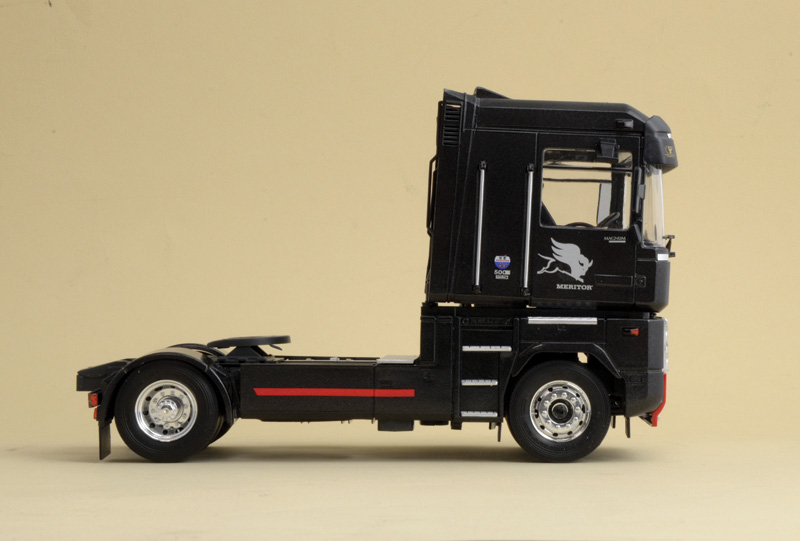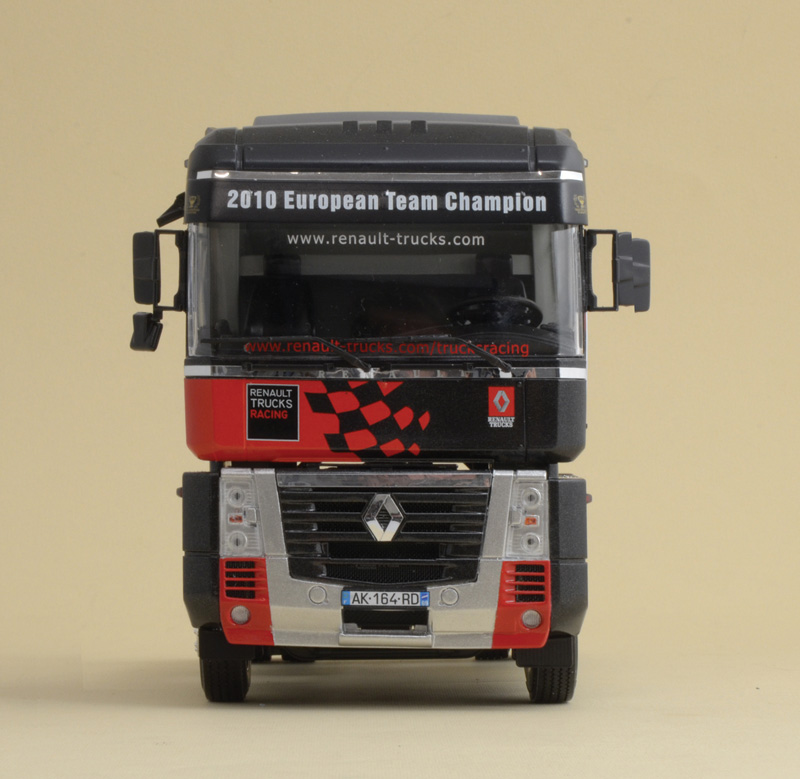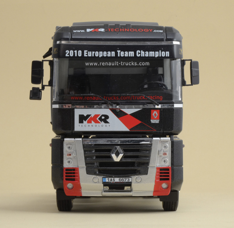 Since the early nineties the Magnum has been part of the truck range of the French truck manufacturer and has become a common sight on European roads. 2001 Renault presents a new version with a number of improvementes and changes, such as a new grill, a new roof spoiler, and a modified dashboard. The engine has been re-designed for improved fuel-efficiency. The cabin, offering top comfort to the driver, can be tilted by almost 90° forward for maintenance and is in the top category as far as comfort is concerned. This model reproduce the actual MAGMUM tractors used from the MKR Technology partner of the RENAULT TRUCK, team invoveld in the “ FIA EUROPEAN TRUCK RACING CHAMPIONSHIP”.