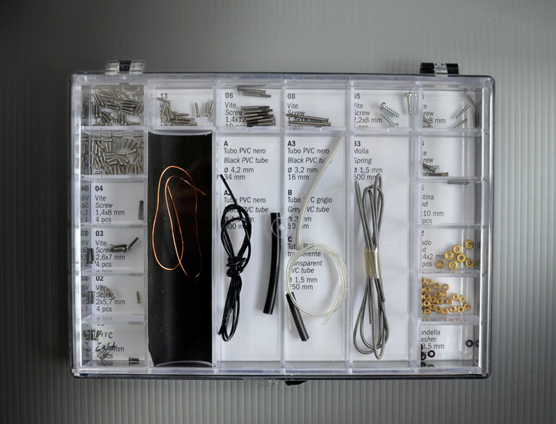 DECALS SHEET - MASKING STICKERS - CLEAR SHEET - BOX WITH SCREWS AND NUTS, LEATHER, COPPER WIRE, PVC TUBES, SPRINGS AND OTHER PARTS