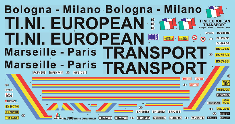The tractor-trailer units with 3-axle trailer are dominating the European long-distance transport. The most common variants are the canvas-container and reefer trailer. Due to the heavy competition in long-distance hauling the owners are forced to utilize the weight limit of 40 tons of a track unit. This requires the application of modern materials like aluminum and plastic in the trailer construction, to keep the weight as low as possible. This trailer can be combined with all Italeri Trucks to impressive units.