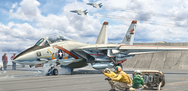 The Vought F-8 Crusader was the first carrier-based fighter designed in the 1950s that attained supersonic flight capability. Due to its Pratt & Whitney turbojet engine with afterburner, it was able to exceed the then maximum speed of Mach 1.8. It entered service in the late 1950s with the U.S. Navy and U.S. Marine Corps fighter squadrons to replace the obsolete Vought F7U Cutlass. The F-8 had good operational longevity and was deployed routinely by the US until the Vietnam War. Armed with four 20mm guns installed on the sides of the large front air intake, it could carry a varied weapons load. This capability provided it with a high degree of operational flexibility on missions, utilising air-to-air missiles, rockets and bombs. Because it was armed with cannons, unlike the more modern and advanced early versions of the missile laden F-4 Phantom II, pilots nicknamed the Crusader “The last of the Gunfighters”. The aircraft was also used by the French Navy’s carrier-based fighter squadron.