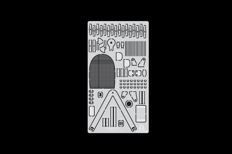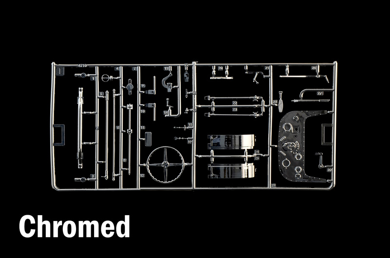 Nuove parti - Ruote sterzanti - Cofano apribile - Motore altamente dettagliato - Ruote in gomma - 2 ruote di scorta - Decal per 2 versioni - Fotoinciso - Parti cromate - Viti, tubi e pelle artificiale - Mascheratura pretagliata - Foglio istruzioni a colori