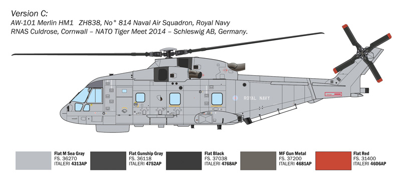 L’AW-101 Merlin è un elicottero multiruolo medio-pesante sviluppato da Agusta Westland (ora Leonardo) in collaborazione con Westland Helicopters. Venne impostato e sviluppato, su indicazione sia della Royal Navy Britannica che della Marina Militare Italiana, per la sostituzione degli ormai obsoleti SH-3D “Sea King”. Entrato in servizio nei primi anni 2000 oltre al principale ruolo di elicottero imbarcato antisommergibile, grazie alla sua flessibilità operativa, è ideale anche, nelle sue diverse configurazioni, per svolgere missioni di trasporto truppe, di soccorso in mare ma anche di “combat S.A.R.”. Può operare in condizioni metereologiche estreme e in ogni ambiente operativo. Grazie alle sue tre turbine il “Merlin” raggiunge la velocità massima di 310 Km/h ed ha un’autonomia operativa di oltre 1350 Km.