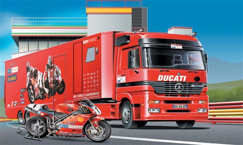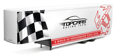 Questo imponente modello è rappresentativo dei semirimorchi a due assi utilizzati per il supporto ai team sportivi impegnati nel World Rally .
