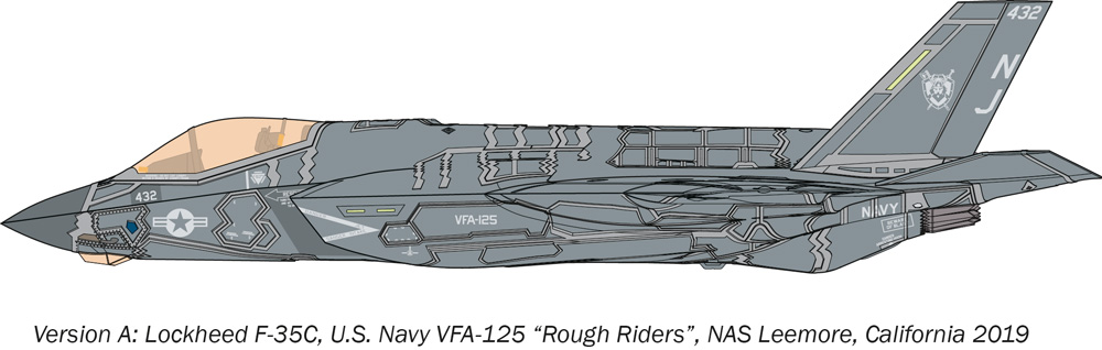The JSF (Joint Strike Fighter) program was established to develop a new fifth-generation, all-weather, multi-role fighter capable of serving as a viable replacement for ground attack aircraft of the United States and NATO countries. From this project emerged the single-seat Lockheed Martin F-35 Lightning II aircraft. Equipped with extraordinary technology, it is characterized by the adoption of an aerodynamic layout, featuring stealth capabilities and a trapezoidal wing design.Designed to perform missions of air superiority, close air support, and ground attack, its airframe can be configured in various setups. The F-35A operates from conventional runways, the F-35B is designed for vertical take-off and landing, and the F-35C is ideal for deployment from conventional aircraft carriers. More specifically, the F-35C is distinguished by its folding wingtips to optimize onboard storage operations, a rear arrestor hook, and a reinforced frontal gear suitable for catapult launch systems on U.S. Navy aircraft carriers.